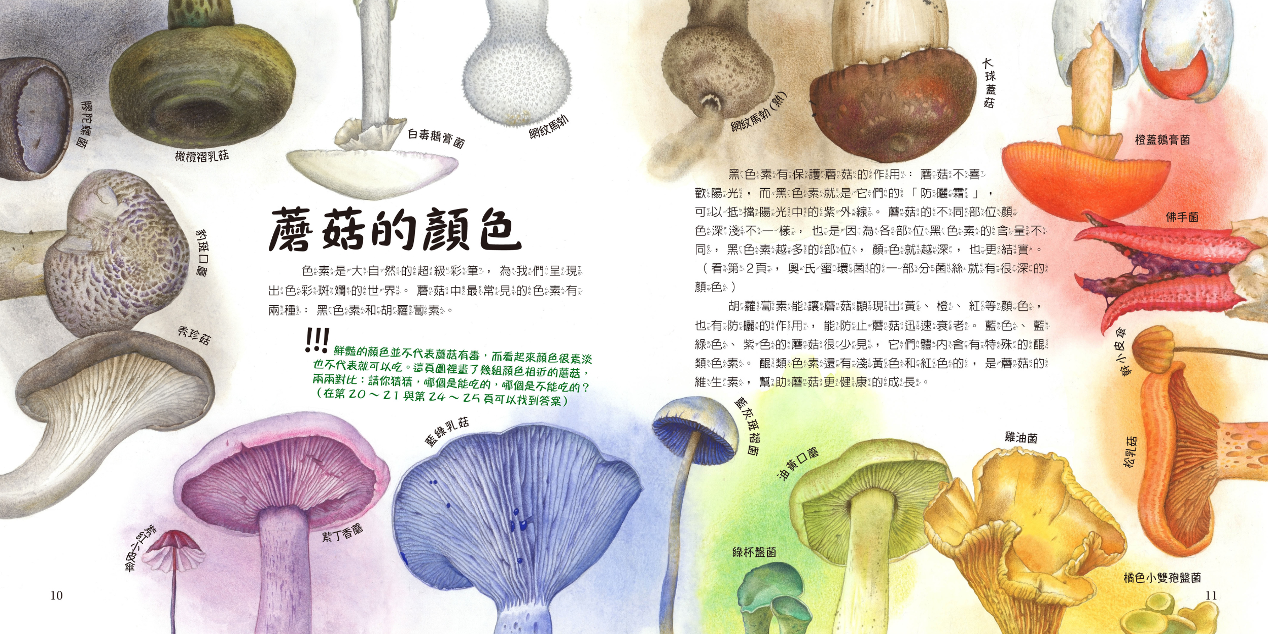 也為讀者破除並非色澤鮮豔的蘑菇才有毒的長期迷思。並於畫面中時不時向讀者提出有趣的反思問題、猜猜看,並有實作互動頁面――