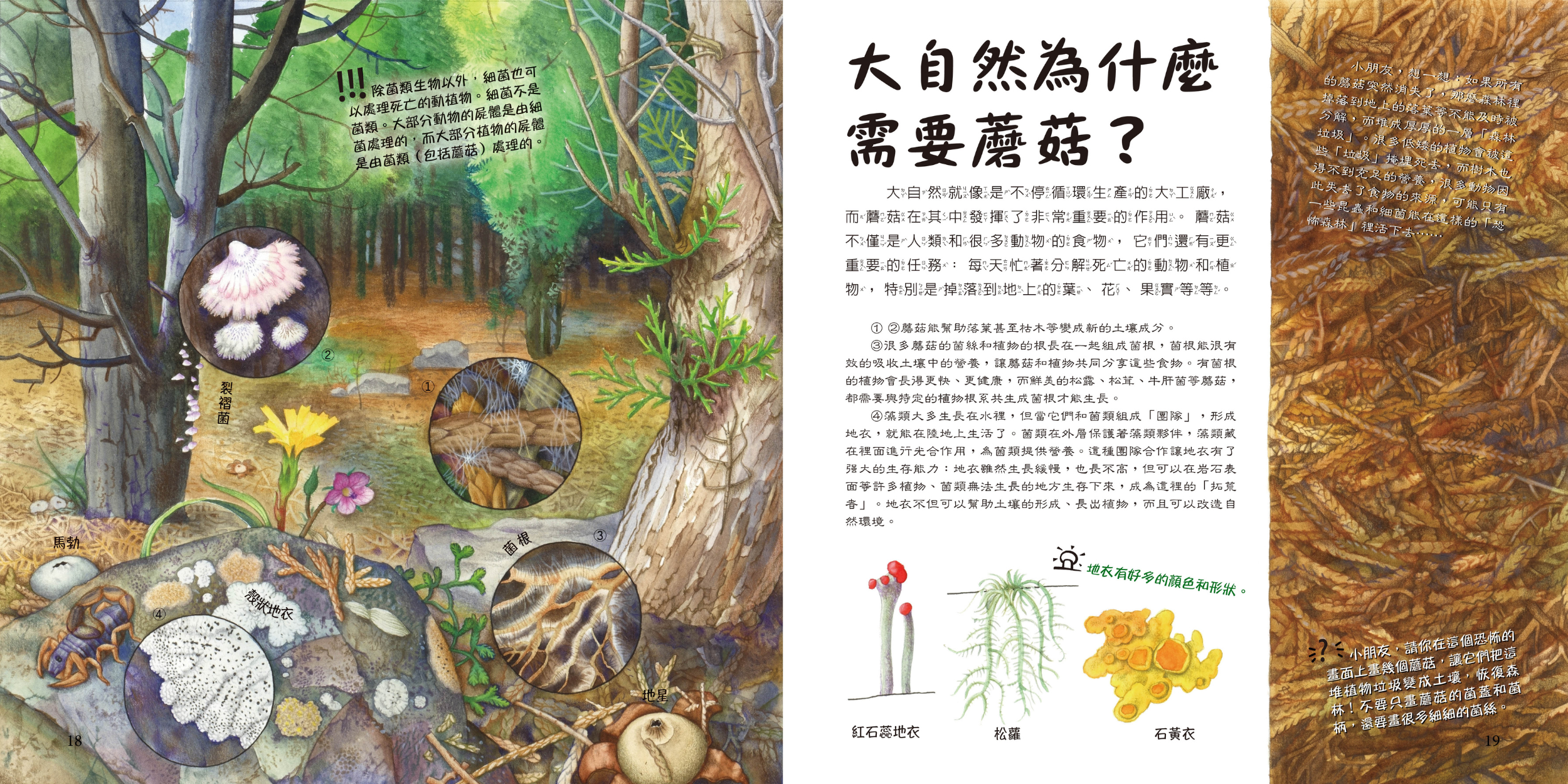 由俄國繪本作家撒沙 (2018年《家門外的自然課》4冊繪本系列的全套作者) 所著的《看! 蘑菇》,為讀者們展現自然界中蘑菇的千姿百態,以及它們如何生長、吸收養分;大自然中「蘑菇」所扮演的重要角色…等。