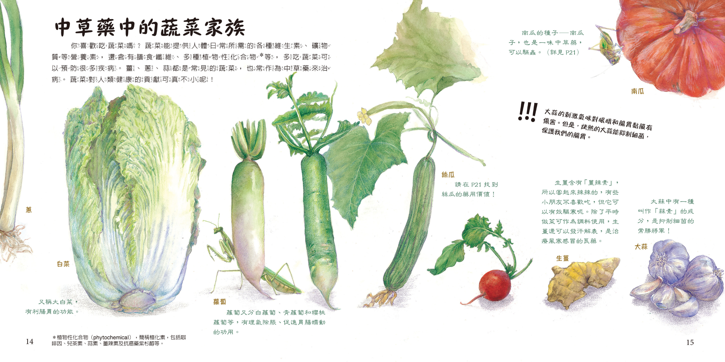 書中也介紹到蔬菜與水果中蘊含的藥性…(終於能有理有據地說服孩子該多吃蔬果了?! 有益健康!),一本你此生錯過便超級可惜的巨實用「草藥科普繪本」!