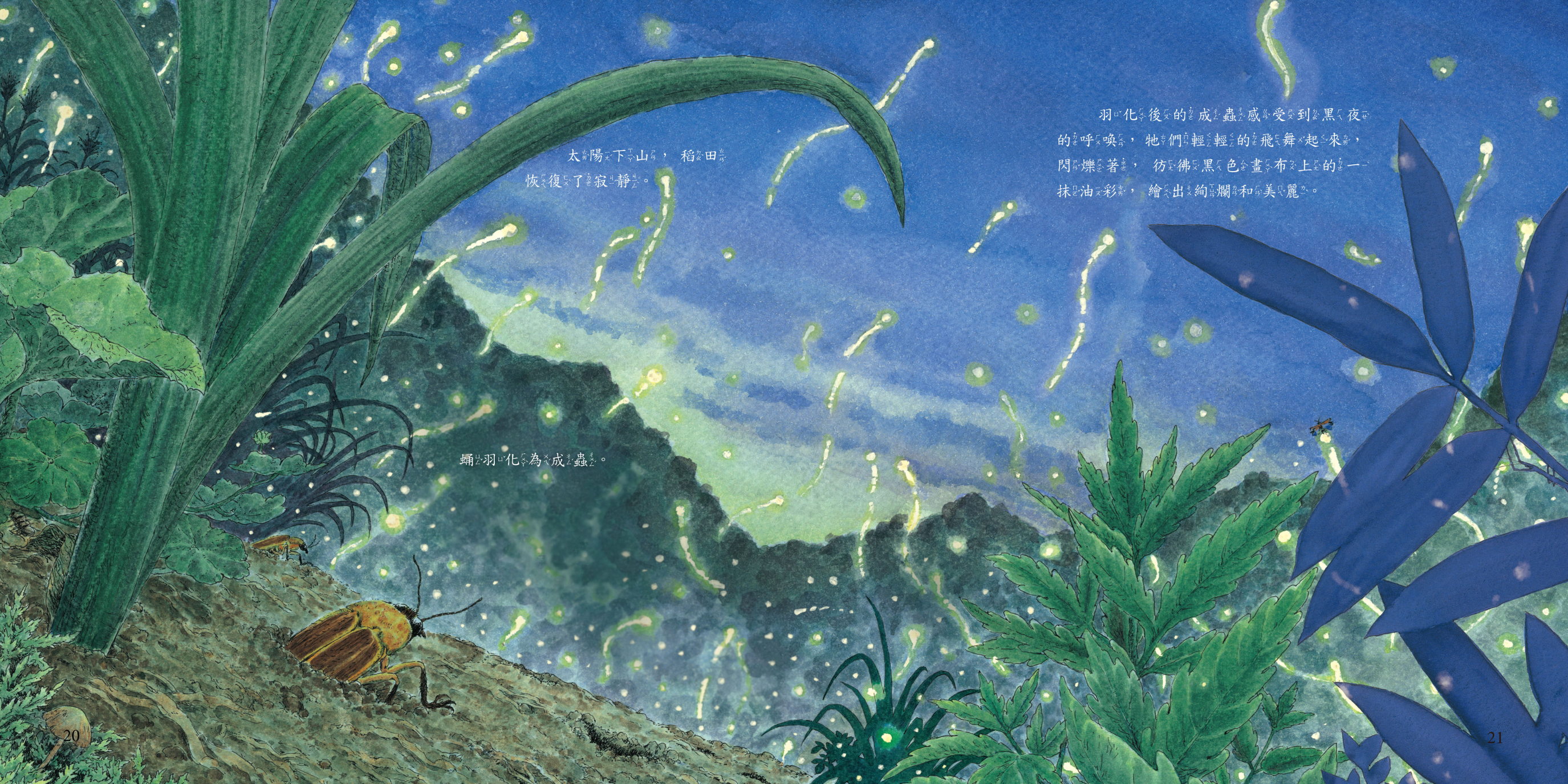 在萬籟寂寂的黑夜中,點點螢光自草叢或河岸邊飛起,佈滿整片夜空――