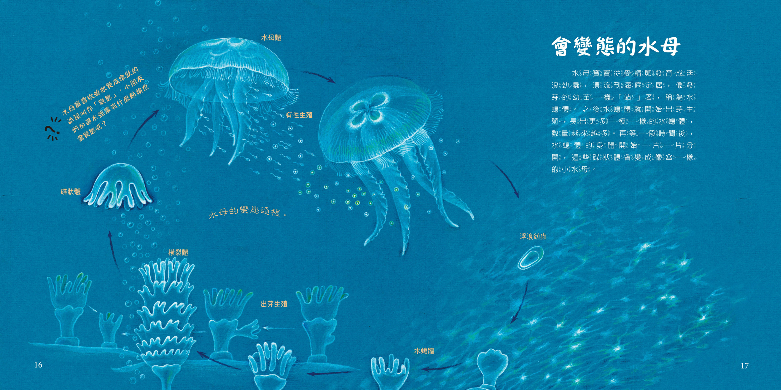 而水母的「繁衍」,除了「有性生殖」更多的則是「無性生殖」,且還會「變態」?!―― 這究竟是怎麼樣奇特的過程呢? 都等待你翻開《哇! 水母》後,一窺究竟。