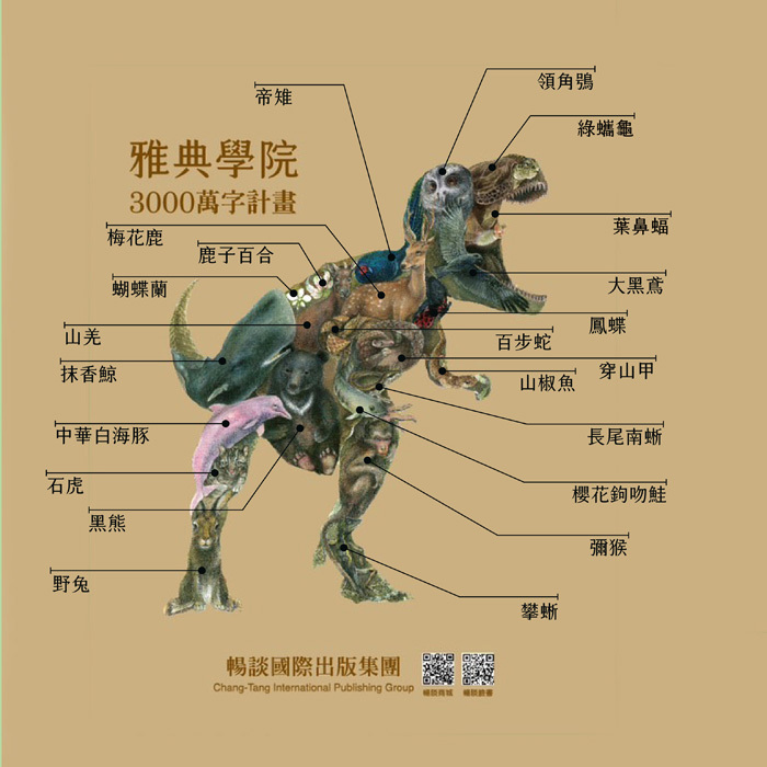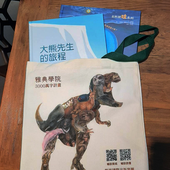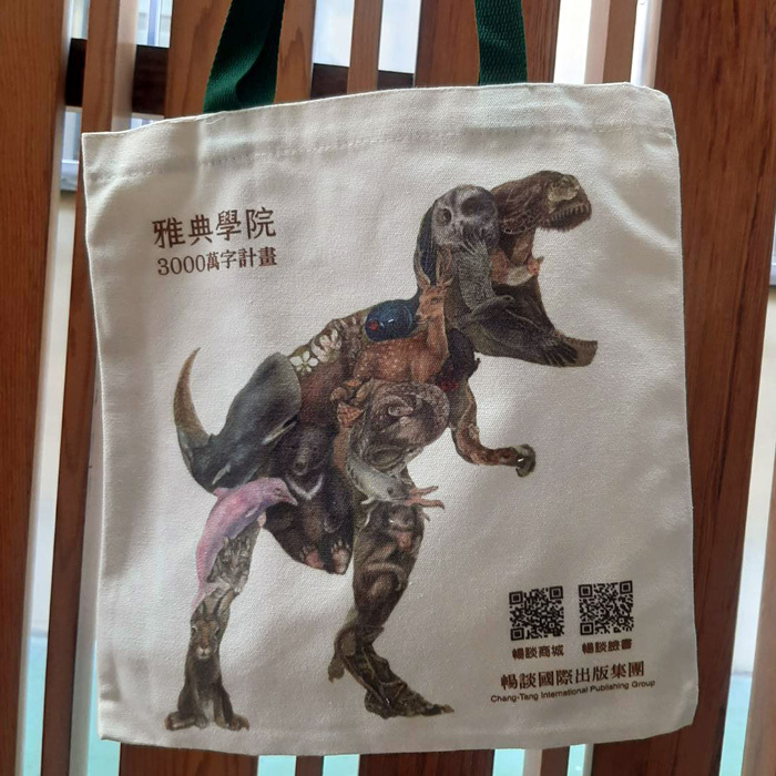 以描繪台灣特有物種,包含動植物,組合成暴龍的帆布袋。